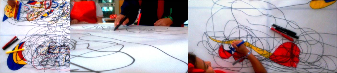 Algo inesperado es nuestra primera actividad. A partir del dibujo automático que experimentaron, entre otros, los pintores surrealistas, proponemos a los niños que, con los ojos tapados y al ritmo de la música, dibujen libremente sobre papel continuo blanco. El dibujo no intencionado es el lugar desde el que comenzamos y es Miró quien nos acompaña en esta actividad. Se trata de que los niños vayan creando a partir de sus dibujos a ciegas y utilizando rotuladores con los tres colores primarios (rojo, amarillo y azul). Durante este proceso van conociendo algunas de las obras de Joan Miró: su lenguaje, simbología, el uso del color… Recorremos el camino inverso al que estamos acostumbrados al dibujar: son las líneas y las superficies de color las que van hablando, las que nos llevan a una historia que contar y nos desvelan el título de nuestros trabajos.
