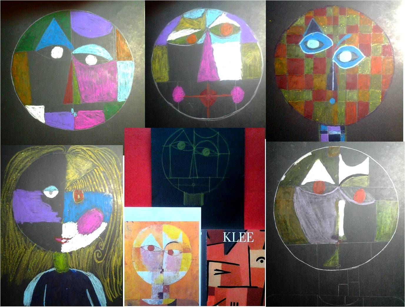 Asamblea: Mirémonos a al cara, podemos establecer algunas líneas imaginarias que organicen un rostro de frente y en reposo: línea vertical de simetría, la línea de los ojos, de la boca… A partir de aquí y tomando como punto de partida el cuadro Senecio (Baldgreis) de Paul Klee hemos empezado nuestra actividad de hoy, que consiste en superponer la geometría a la representación de una «cara-máscara»: de una imagen real o imaginada.