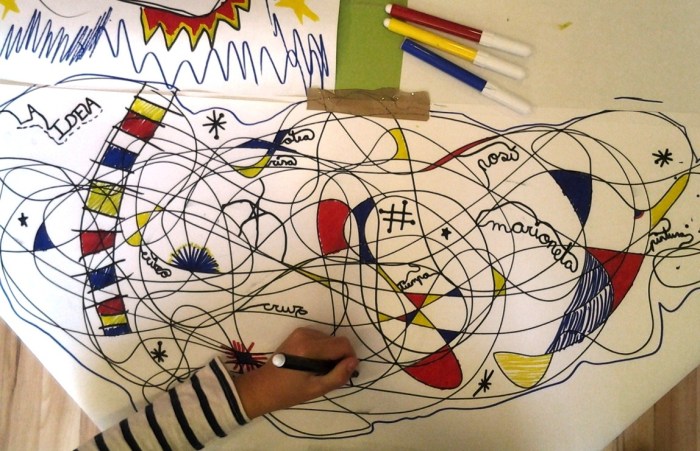 A partir del dibujo automático que Joan Miró practicó para algunas de sus obras, proponemos a los niños que realicen trazos continuos en un papel, pero con los ojos cerrados y siguiendo la música que escuchan. Invertimos el «proceso de dibujar»: nuestra intención desaparece en esta primera fase, no sabemos qué dibujo saldrá, el rotulador baila solo. Al abrir los ojos: sorpresa!… qué nos encontramos?… Ahora sí, ya somos nosotros los que decidimos: el dibujo nos habla, nos sugiere formas (reconocibles o no) y nosotros, utilizando los tres colores primarios, vamos creando.