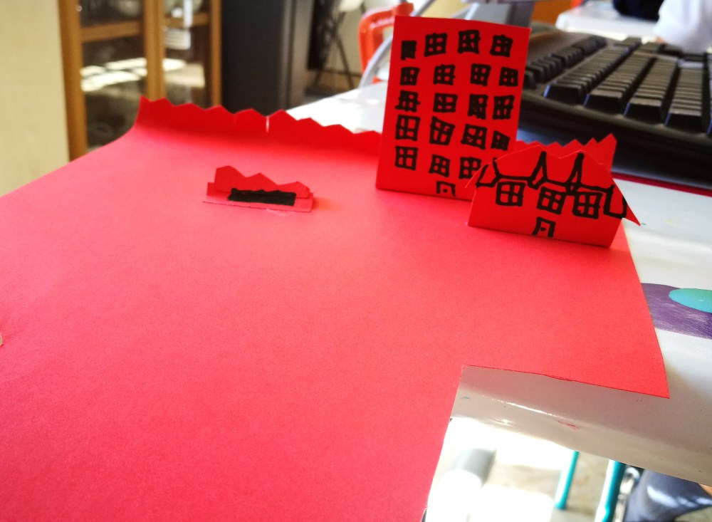 Con los otros dos grupos la propuesta se dirige a «descubrir» las mil historias que puede esconder una hoja de papel. Se trata de transformar un A4 de cartulina roja: puede crecer, plegarse, podemos dejar nuestras huellas gráficas… Creamos trascendiendo la planitud y la «hoja en blanco» y buscando nuevos lenguajes y formas.