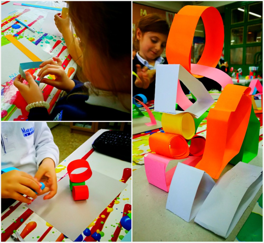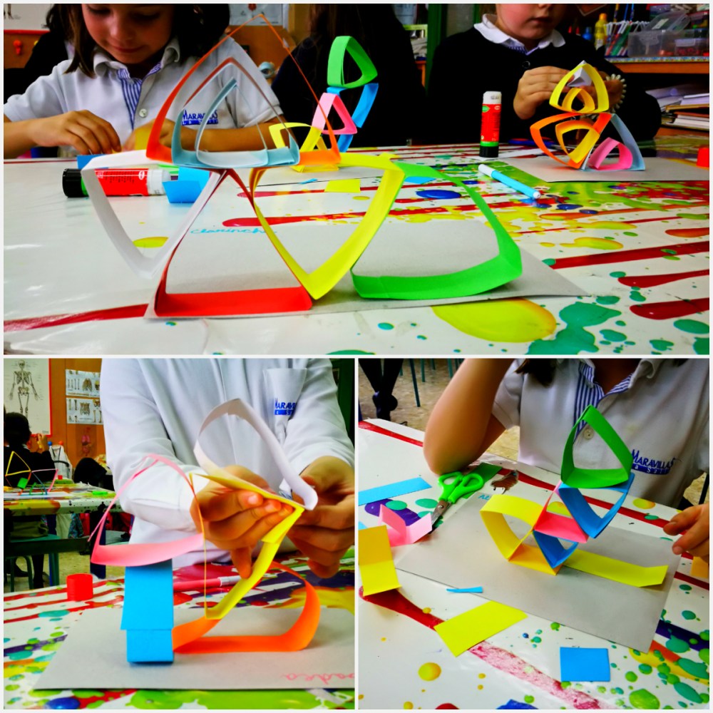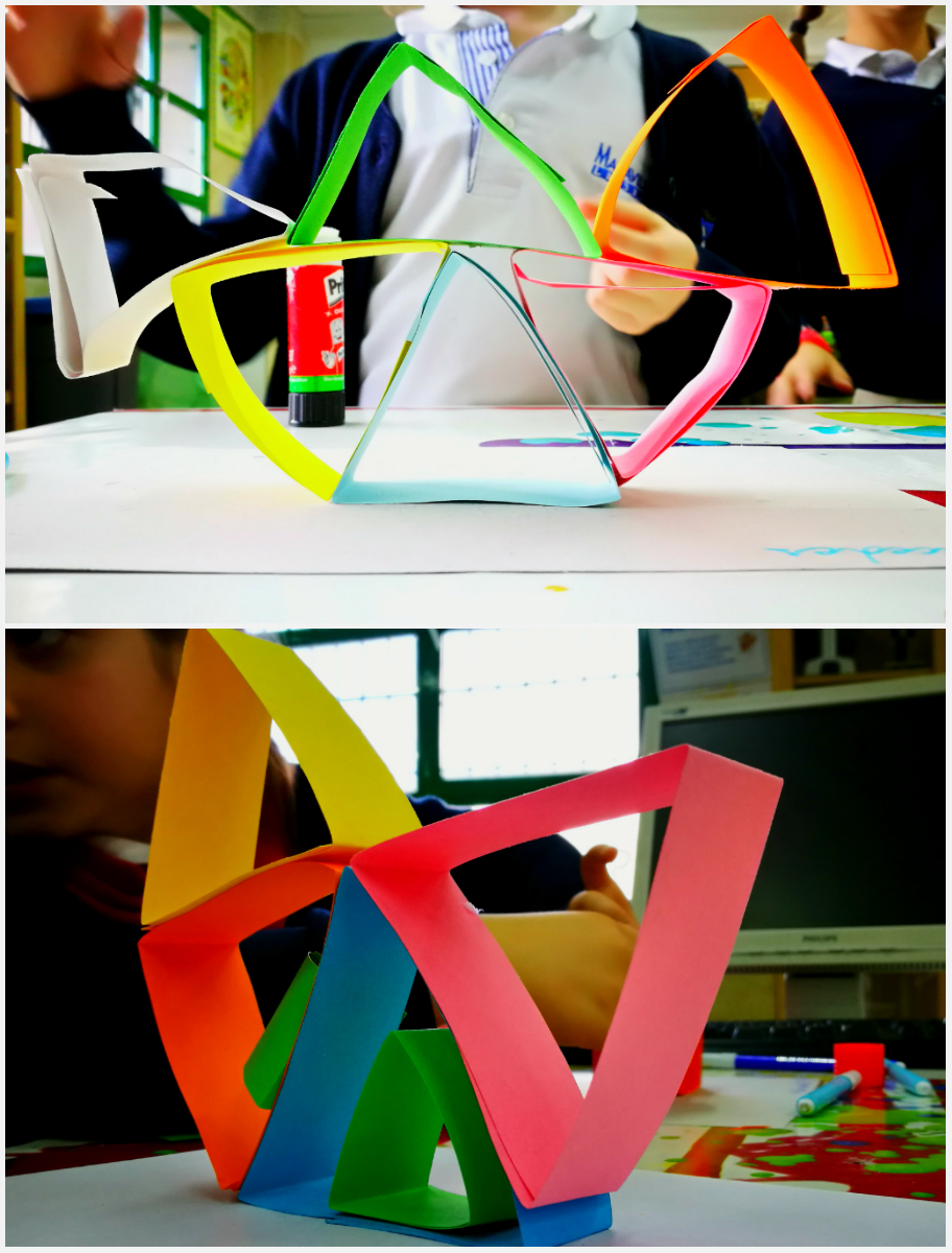 lab_paper sculpture! Experimentamos con nuestro material favorito: EL PAPEL. Construimos formas geométricas. La misma forma geométrica, de diferentes tamaños y diferente color, se repite y repite para crecer y convertirse en una escultura.